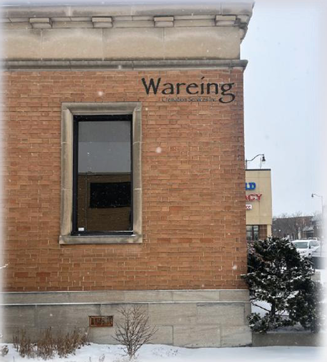 Wareing Cremation Services has moved our Establishment to a larger and brighter building at 161 Broadway St., Tillsonburg, Ontario N4G 3P9. Our new location is on the corner of Broadway and Ridout St. West.